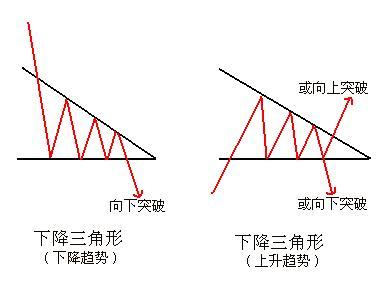 [1]下降三角形属于整理形态,上升三角形在上升过程中出现,暗示有向上突破的可能,而下降三角形在下降趋势中出现则暗示有向下突破的可能.下降三角形出现在上升趋势中,在实际走势下突破方向存在变数,在实际运用的时候需要结合均线系统等其它技术指标来综合判断.