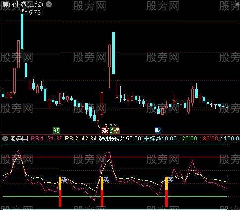 {使用说明:白色横线是强弱分界,其上出现朝下的红橙两色的柱子,是买入信号;顶部的蓝色线是坐标线,其上若是出现朝下的蓝红两色的柱子,是卖出信号!}