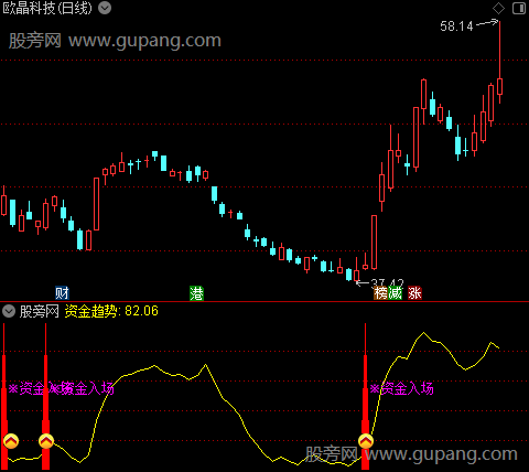 DRAWTEXT( GHCZS4 AND CROSS(资金趋势,9),55,' ※资金入场'),COLORMAGENTA;